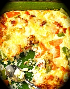 Smörj en ugnsfast form med smör. Vispa ihop ägg, ost och grädde. Fördela laxen, skuren i små bitar, och grönsaksblandningen i formen. Slå på äggsmeten och grädda i 20 minuter.