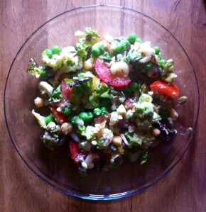 Skär salladen, tomaterna, avokadon i bitar. Lägg de frysta ärtorna i kokande vatten och koka i en minut. Häll av vattnet, tillsätt 2 msk kokosfett i rör om. Strö över lite peppar och salt.