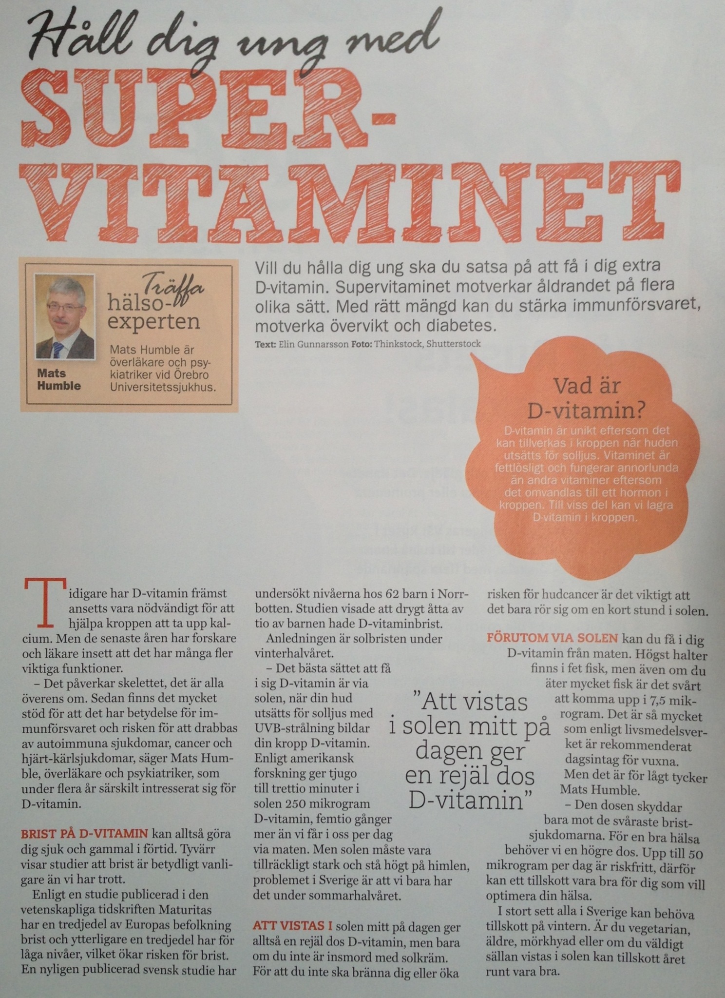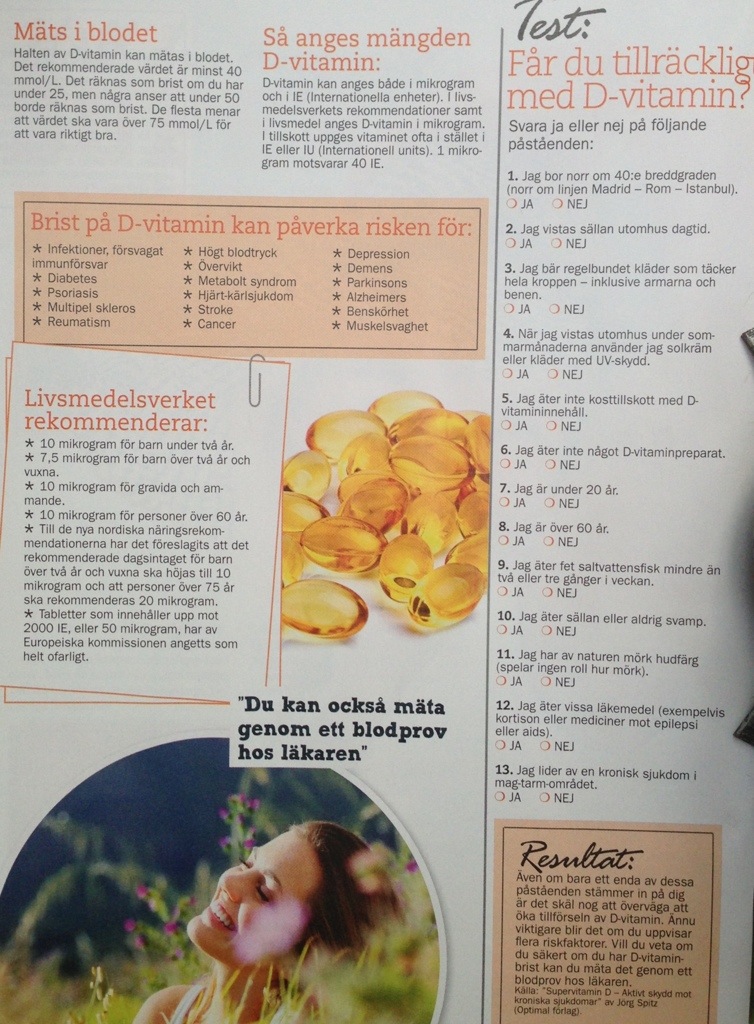 Tidningarna uppmärksammar numera allt oftare betydelsen av ett av de absolut viktigaste vitaminerna. Lägger här in en hel artikeln om D vitamin från ”Min Hälsa” Expressens nyaste bilaga. Vill du läsa mera om D-vitamin, använd sökfunktionen uppe till höger på sidan. Artiklar finns om bl.a D-vitaminets betydelse vid olika sjukdomar.