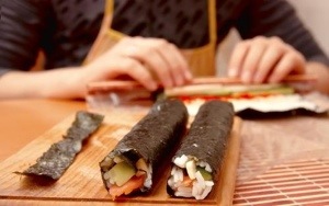 Fukta kanten med lite vatten och rulla ihop rullen med hjälp av bambumattan eller handduken. Om sushin inte ska ätas direkt så linda in den i plastfolie och låt stå i kylen. Vid servering, skär rullen i centimeter stora bitar.
