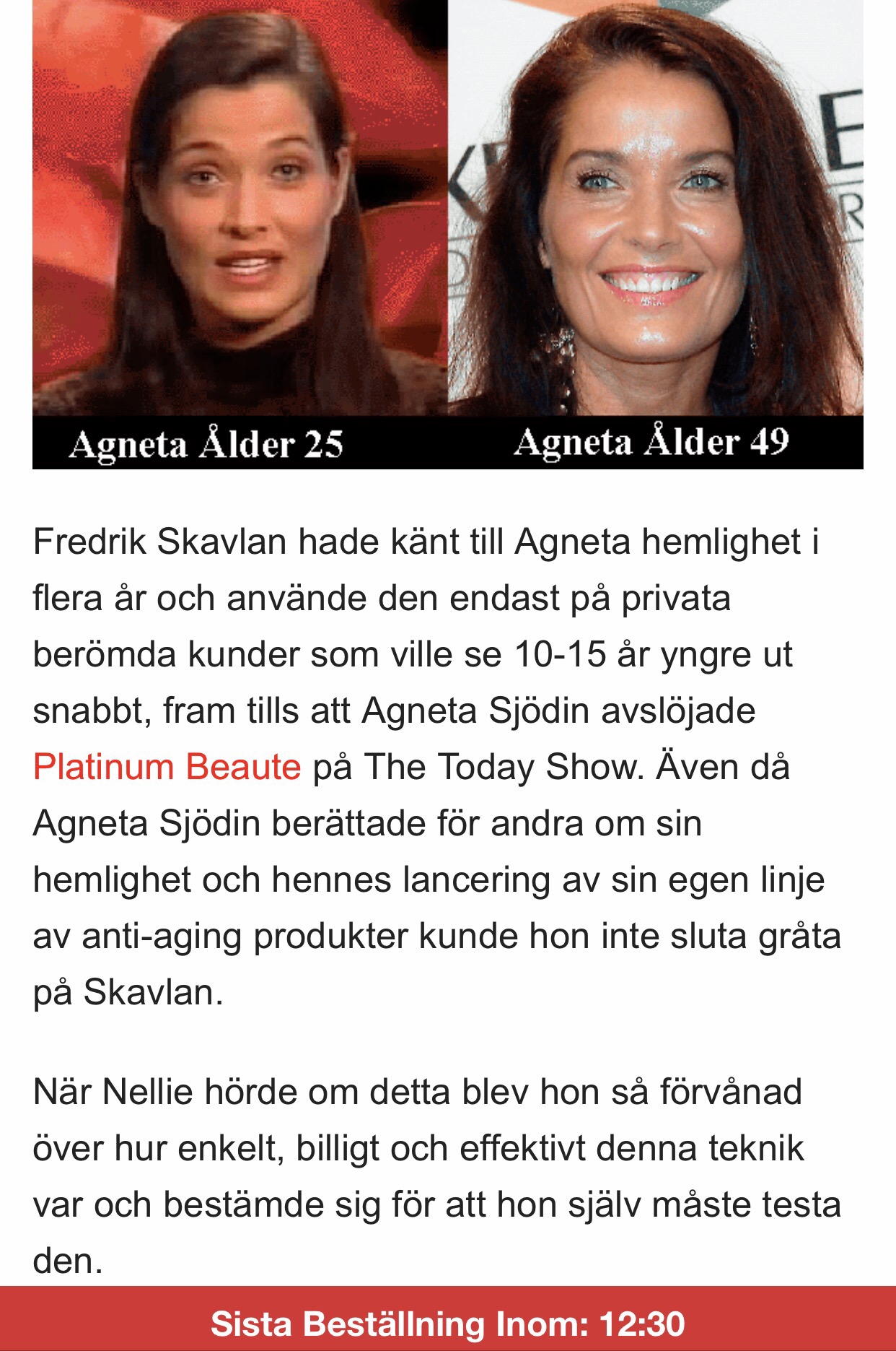 Det dyker ibland upp en annons om en mirakelprodukt mot rynkor. Annonsen har haft lite olika utformning men nu har man börjat använda sej av svenska kändisar. Senast såg jag Agneta Sjödins ansikte i annonsen där hon lovordar denna ”fantastiska produkt” och även Skavlan blir inblandad. Annonsen är även på ganska dålig svenska.